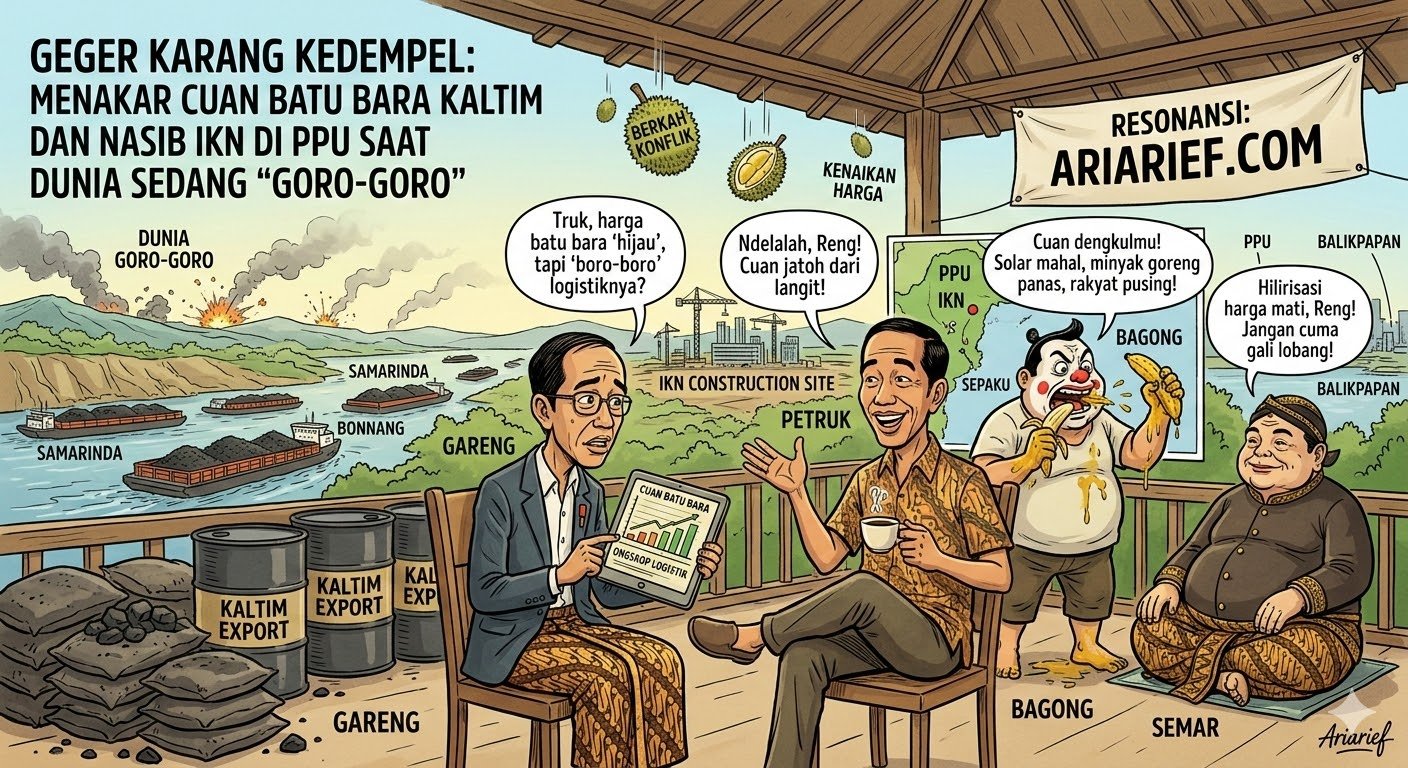 Gareng menarik napas panjang. Beruntung di tahun 2026 ini, Karang Kedempel—eh, Kaltim, punya proyek raksasa IKN. Bagi Gareng, IKN ini ibarat “Rem Pakem” agar ekonomi daerah tidak liar mengikuti goyangan geopolitik dunia yang sedang mabuk kepayang.
