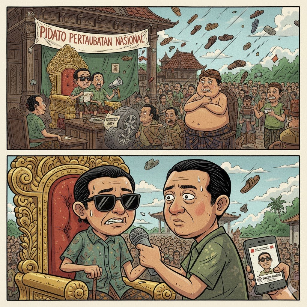 Maka, tibalah hari yang paling dinanti seluruh rakyat Republik Karang Kedempel. Pidato Pertaubatan Nasional. Presiden Gareng ingin membuktikan bahwa dia bukan “Jenderal Gembos” yang cuma berisi angin, melainkan pemimpin yang punya isi (walaupun isinya masih diperdebatkan).