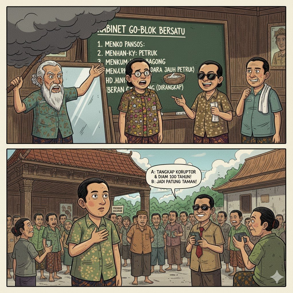 Dan Semar? Ia kembali duduk di bawah pohon beringin, mengamati anak-anaknya sambil berbisik, “Negara itu rusak bukan karena nggak ada orang pintar, tapi karena orang pintarnya diajari ‘Go-Blok’ sama yang suka ngibul.